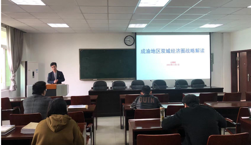 11月1日下午,m88登录入口官网第三期“景明论坛”在经管楼401成功举办。m88登录入口官网副院长江晓晗作了题为“成渝地区双城经济圈战略解读”的学术报告,m88登录入口官网部分师生聆听了报告。