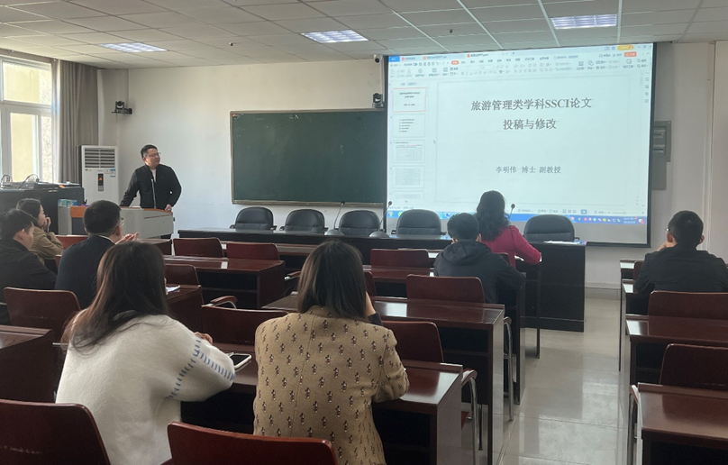 3月13日上午,m88登录入口官网第七期“景明论坛”在经管楼401会议室成功举办。m88登录入口官网李明伟博士作了题为“旅游管理类学科SSCI论文投稿与修改”的学术报告,m88登录入口官网部分师生聆听了报告。