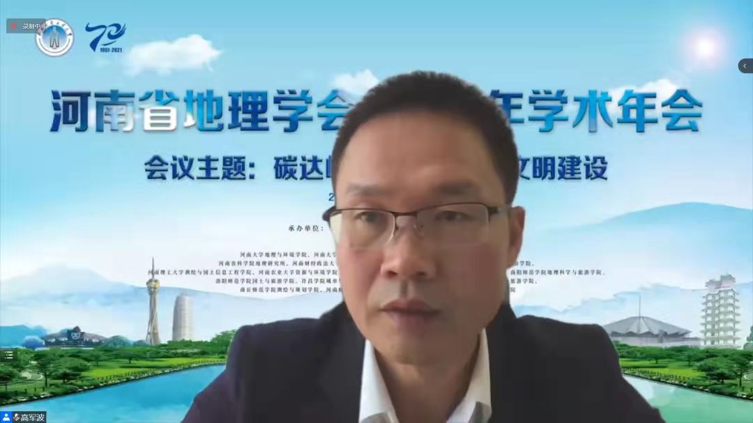 会上,高军波教授应邀与来自河南大学、河南理工大学的两位教授组成会议主持及点评专家组,对“双碳目标下的区域发展”会场报告作了逐一点评。钟明星博士、王国奎博士分别做了题为《生态系统服务价值与景观格局时空演变分析——以中原城市群为例》、《“双碳”目标背景下传统能源基地转型发展研究——以甘肃省为例》的专题报告,受到与会专家好评。