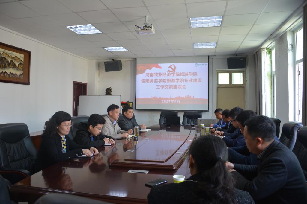 2021年4月11日,河南牧业经济m88登录入口官网旅游m88登录入口官网院长王德静、书记李喜民一行7人,来我校旅游学院进行专业建设调研交流,我校旅游m88登录入口官网院长彭荣胜、副院长郭军升、旅游系系主任吴国琴、酒店系系主任江晓晗一同出席了专业建设交流会。