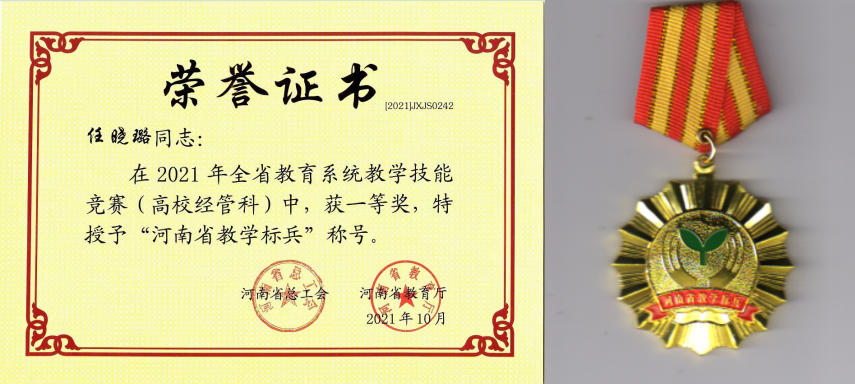 近期,m88登录入口官网教师在河南省教育厅、河南省总工会组织的2021年度全省教育系统教学技能竞赛中再获佳绩,任晓璐老师荣获高校经管科一等奖,同时被授予 “河南省教学标兵”称号并颁发奖章。
