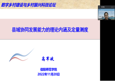 11月20日,由中国地理学会农业地理与乡村发展专业委员会、长安大学等单位联合主办的“数字乡村建设与乡村振兴”科技论坛在西安召开,会议以在线形式召开。m88登录入口官网高军波教授在第五分会场“乡村地域系统转型与城乡融合发展”参会,做了题为“县域协同发展能力的理论内涵及定量测度”报告,并应邀作为下半场会议主持人。