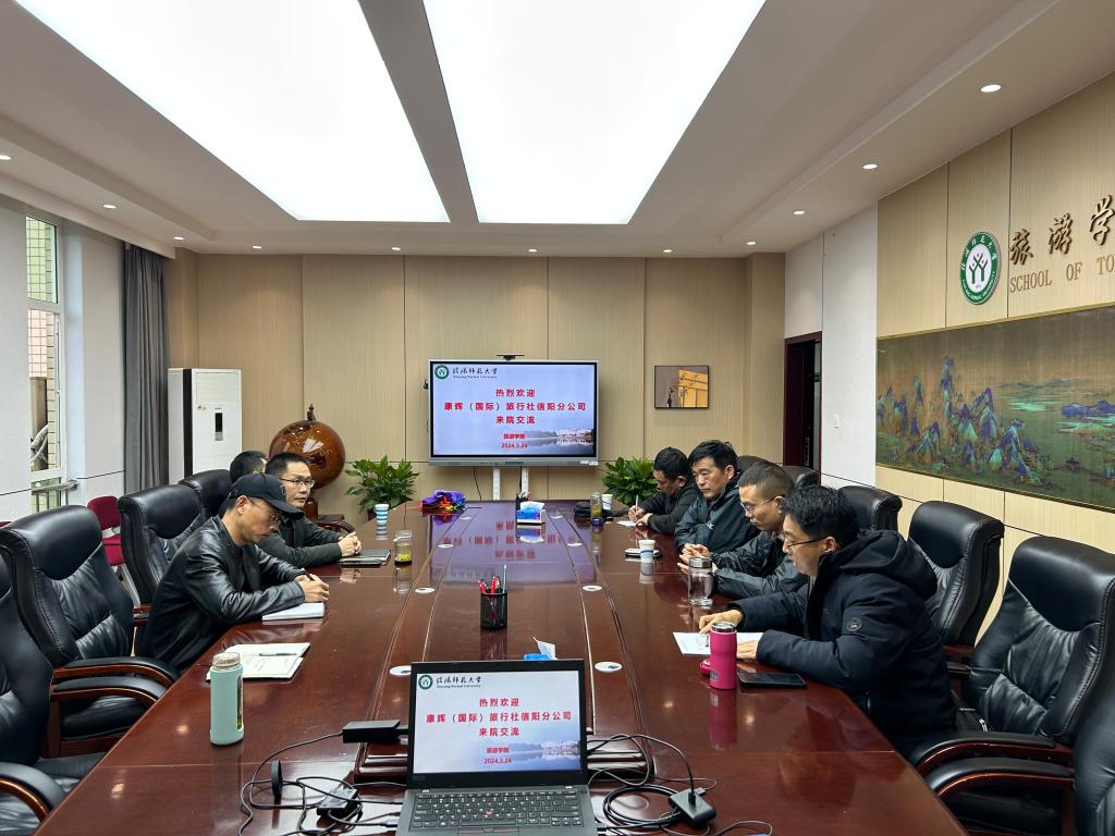 3月24日下午,康辉(国际)旅行社信阳分公司总经理刘礼纯一行来院考察交流。m88登录入口官网院长高军波、副院长胡宝珠在经管楼404会议室与来宾进行了座谈。