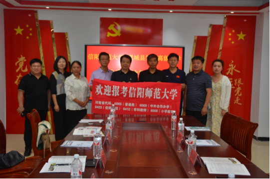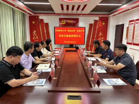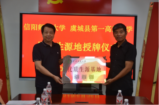 为了进一步加强高校与中学之间的交流合作,优化生源结构和提升生源质量,6月26日上午,m88登录入口官网党委书记雷前龙、党委副书记路璐、旅游管理系主任罗艳玲、就业工作秘书黄倩一行四人赴商丘市虞城县第一高级中学举行“优质生源基地”签约授牌仪式暨招生宣传工作,商丘市虞城县教体局副局长杨海旺、商丘市虞城县第一高级中学党委书记余坤、校长李连生、信阳师范大学商丘校友会会长、商丘市基础教育发展中心主任李青峰、信阳师范大学商丘校友会秘书长郑华鑫等出席签约仪式。